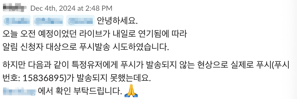 그래서 한동안 푸시 대상자들에게 알림이 정상적으로 도달하지 않는 문제가 반복적으로 발생했다. 어떤 경우에는 전체 대상에게 모두 정상적으로 발송되었지만, 일부 케이스에서는 발송이 중간에 멈추거나, 로그상으론 성공으로 표시되지만 실제로는 수신되지 않는 등 일관되지 않은 패턴이 확인되었다.