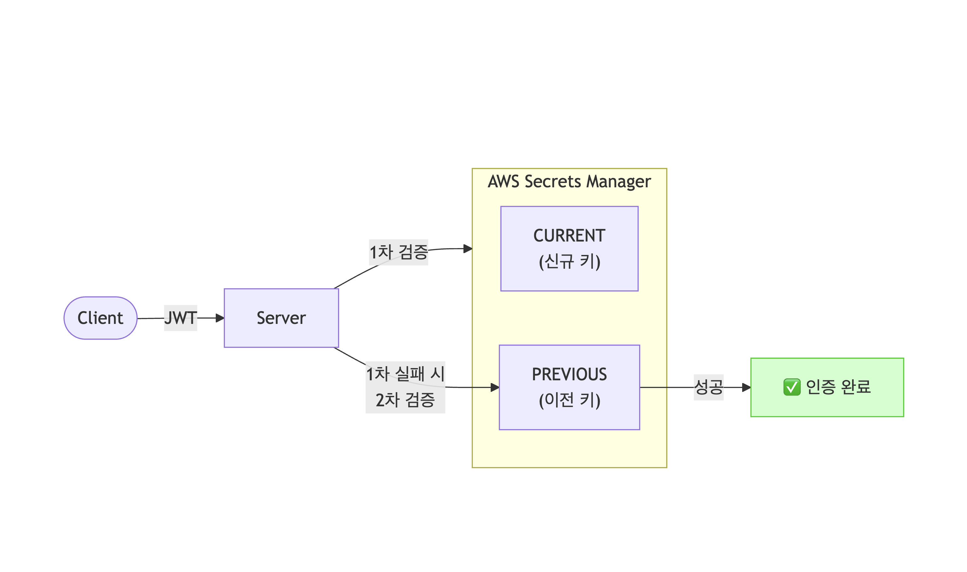 핵심 아이디어는 Secrets Manager에 두 개의 키를 저장하고, CURRENT → PREVIOUS 순서로 폴백 검증하는 구조다.